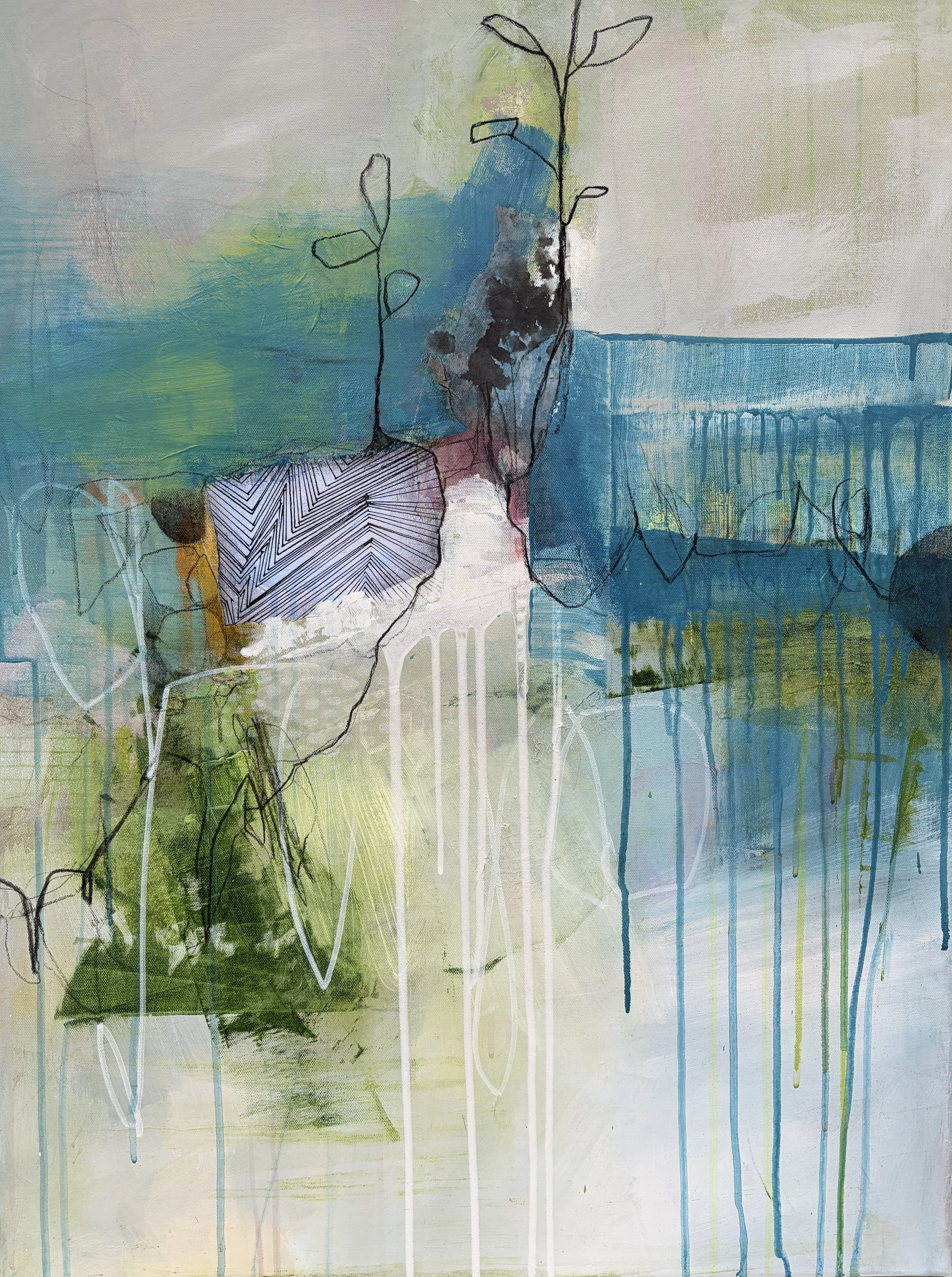 “Backyard Party” is a playful, energetic abstract painting that celebrates connection and spontaneity. Its vivivd greens and pinks feel like fresh grass, laughter, and summer air, while the layered textures and bold marks hint at an urban edge — as if this gathering happens in a city backyard.